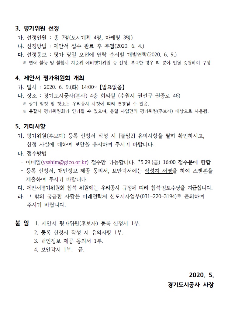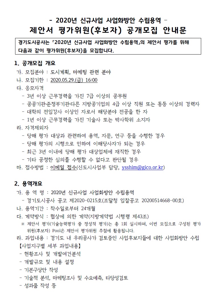 [경기도시공사] 제안서 평가위원 후보자 추천 요청 및 등록 신청 안내(2020년 신규사업 사업화방안 수립용역)