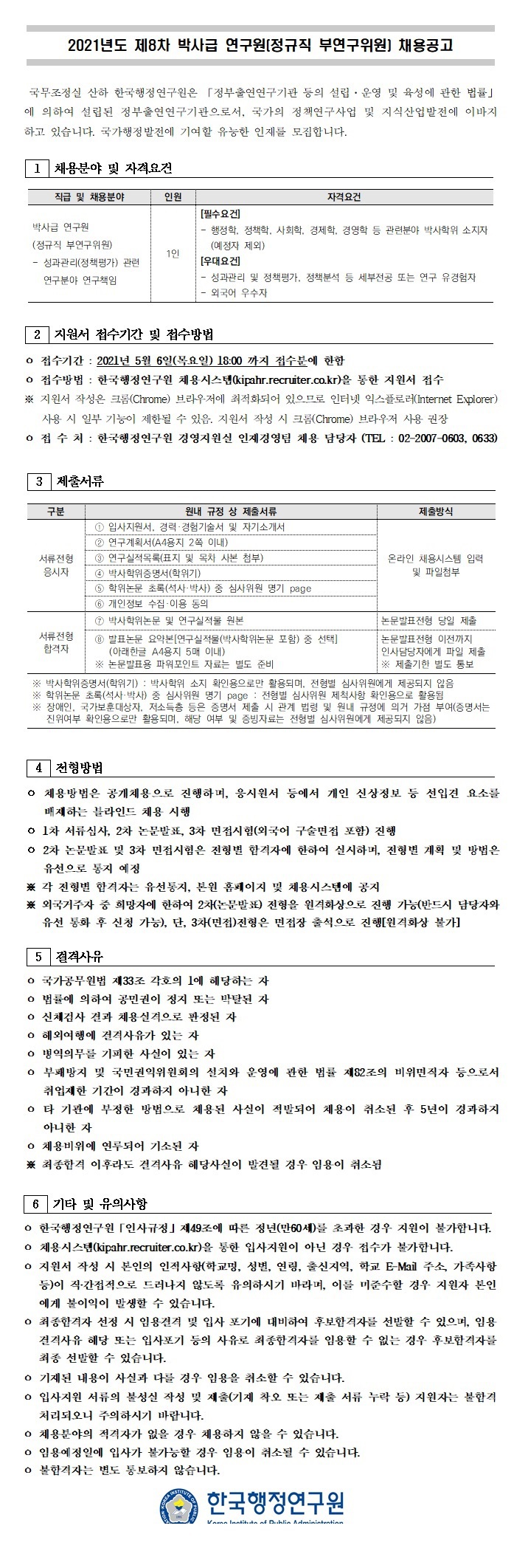 [한국행정연구원] 2021년도 제8차 박사급 연구원(정규직 부연구위원) 채용공고