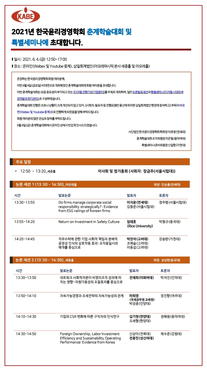 ㅇ 관련자료와 Webex/Youtube 링크는 춘계학술대회 2일 전 한국윤리경영학회 홈페이지 및 이메일을 통해 안내드릴 예정입니다.