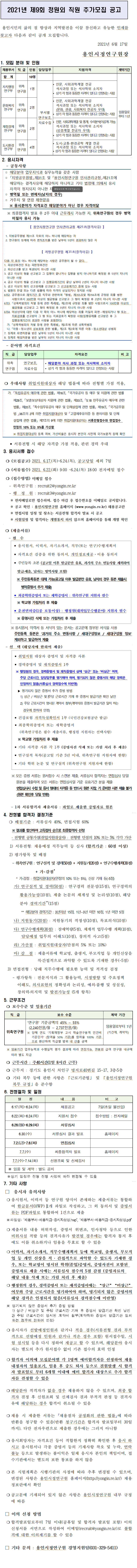 [용인시정연구원] 2021년도 제9회 정원외 직원 추가모집 채용공고