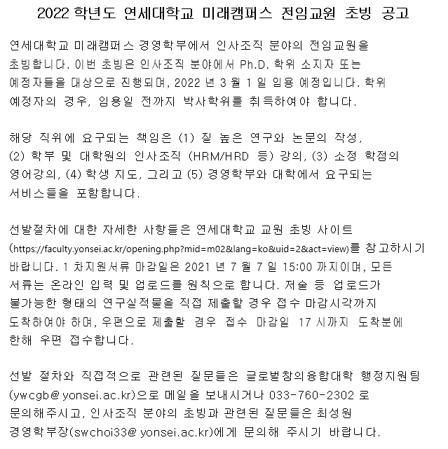 연세대학교 미래캠퍼스 전임교원 초빙공고