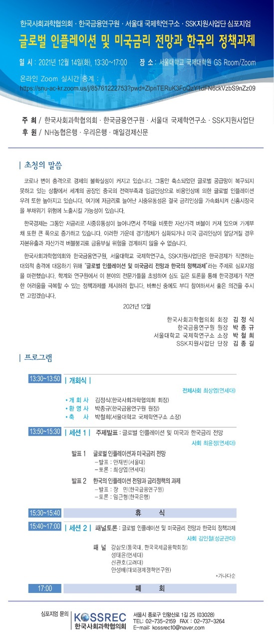 [한국사회과학협의회] 글로벌 인플레이션 및 미국금리 전망과 한국의 정책과제 심포지엄 안내