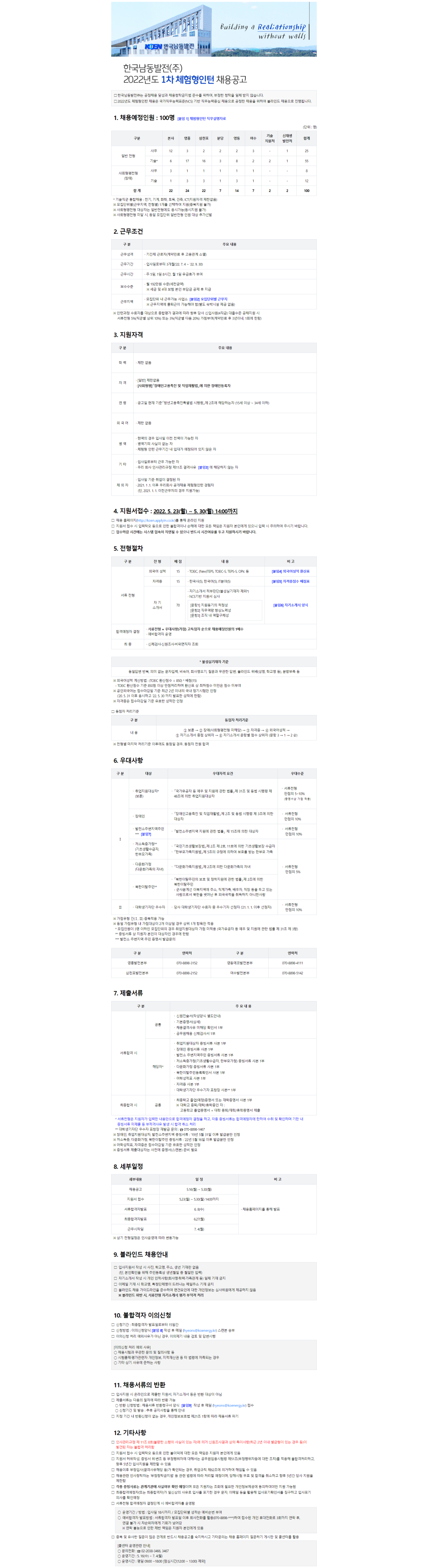 [한국남동발전] 2022년도 1차 체험형인턴 채용공고