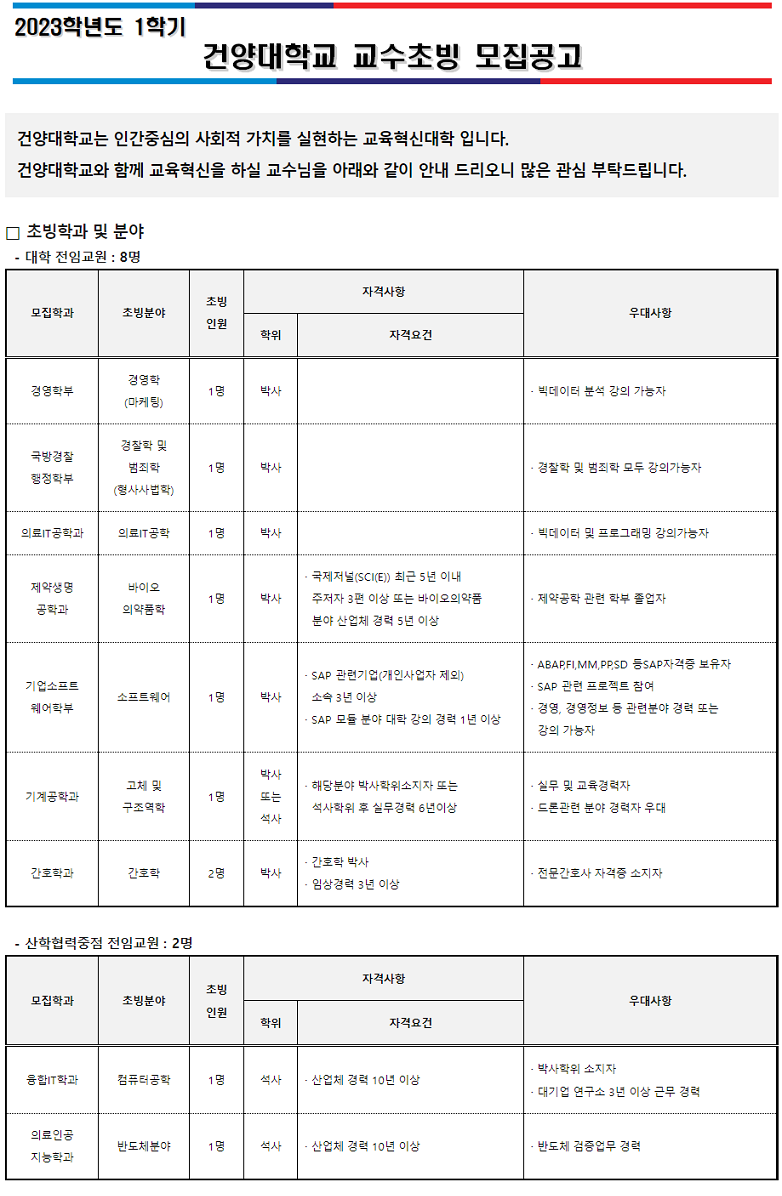 건양대학교에서 교수 초빙공고가 있어 다음과 같이 안내드립니다.