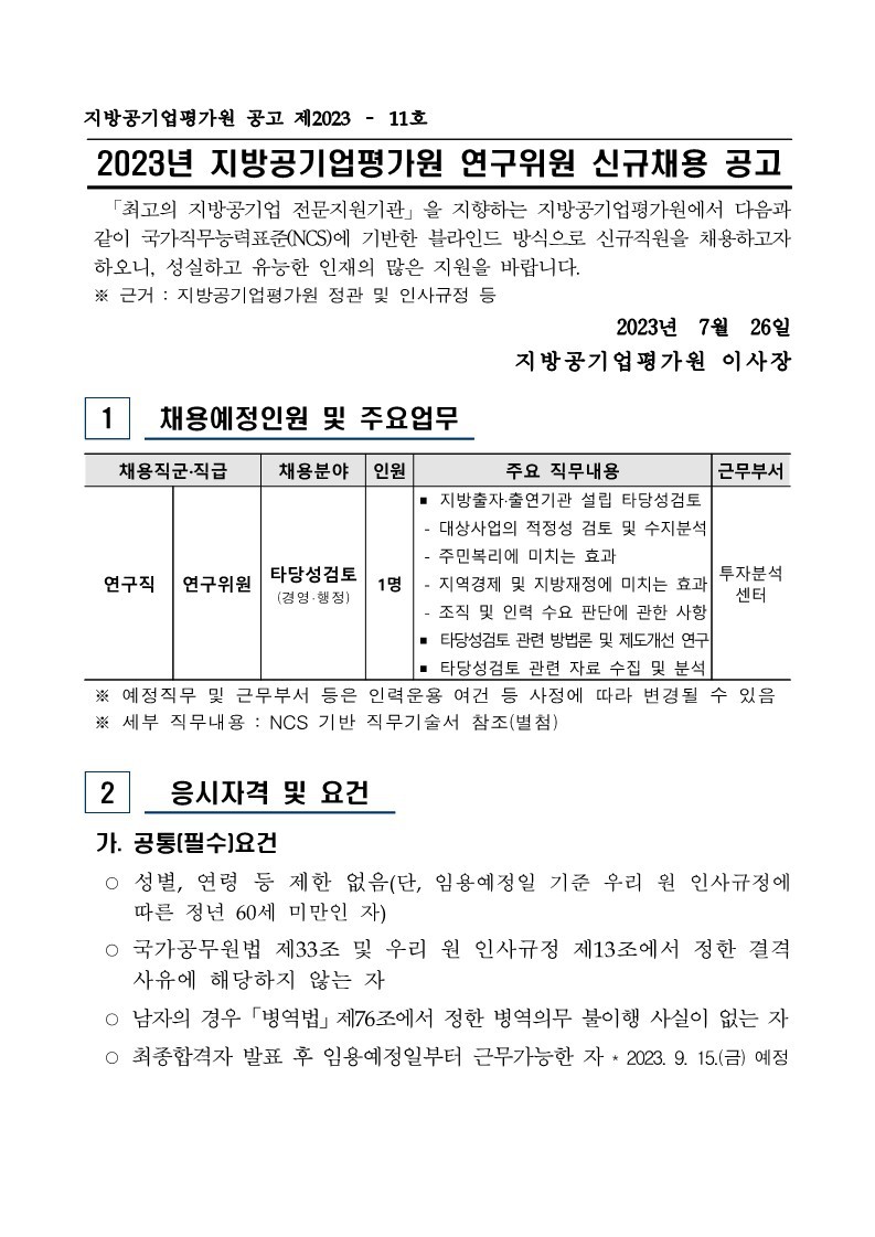 [지방공기업평가원] 2023년 연구위원 신규채용 공고