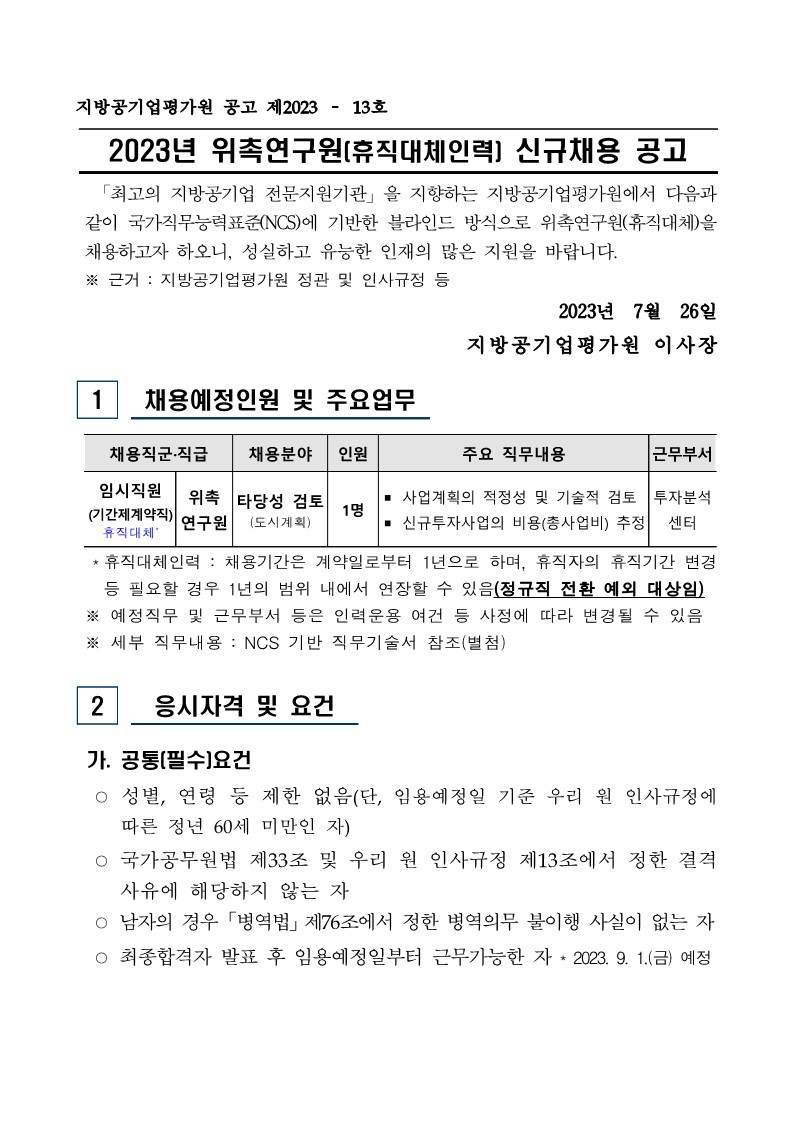 [지방공기업평가원] 2023년 위촉연구원 신규채용 공고