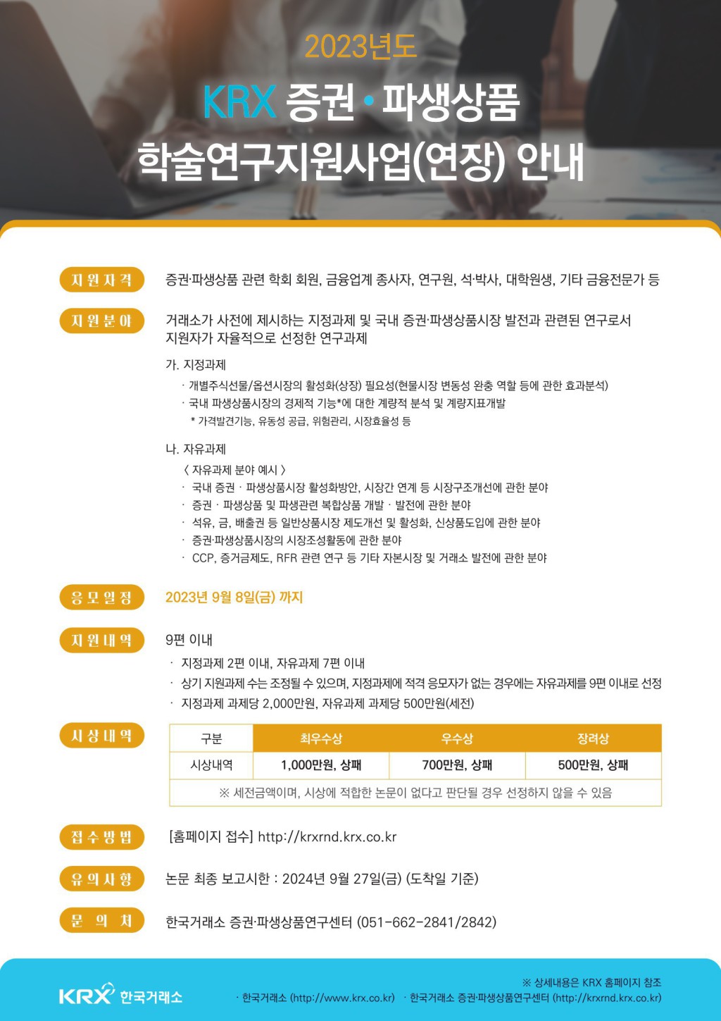 [한국거래소] 2023년도 KRX 증권·파생상품 학술연구지원사업(연장) 안내
