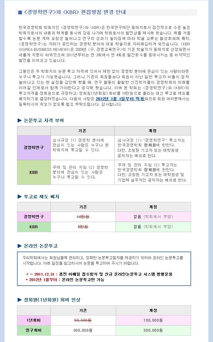 <경영학연구> 편집방침 변경 / 회비변경안내 외