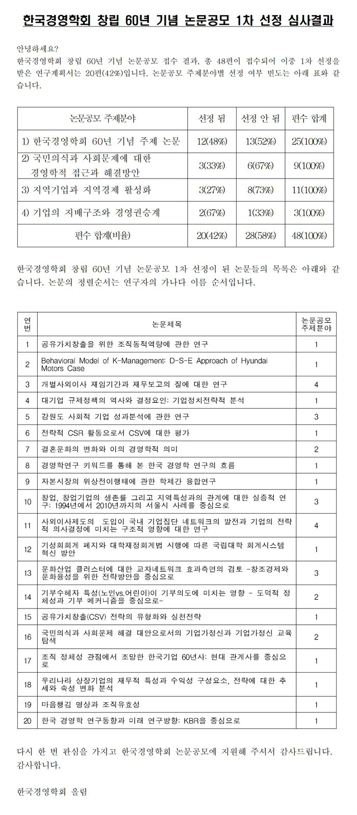 [한국경영학회] 창립 60년 기념 논문공모 1차 선정 심사결과
