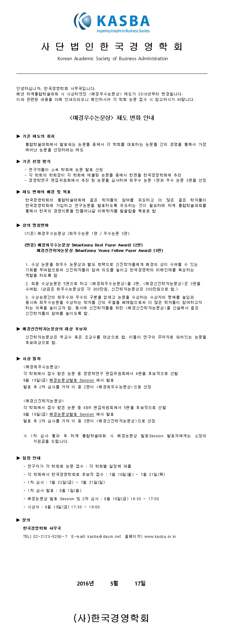 [한국경영학회] <매경우수논문상> 제도 변경 안내