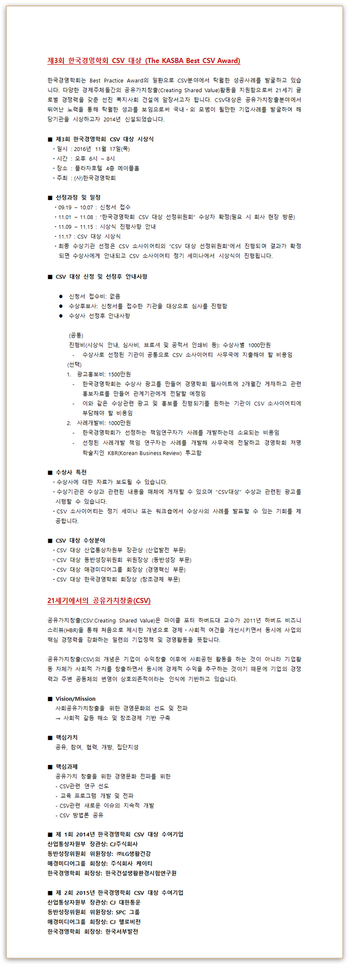 [한국경영학회] 제3회 한국경영학회 CSV대상 수상기관 신청 안내