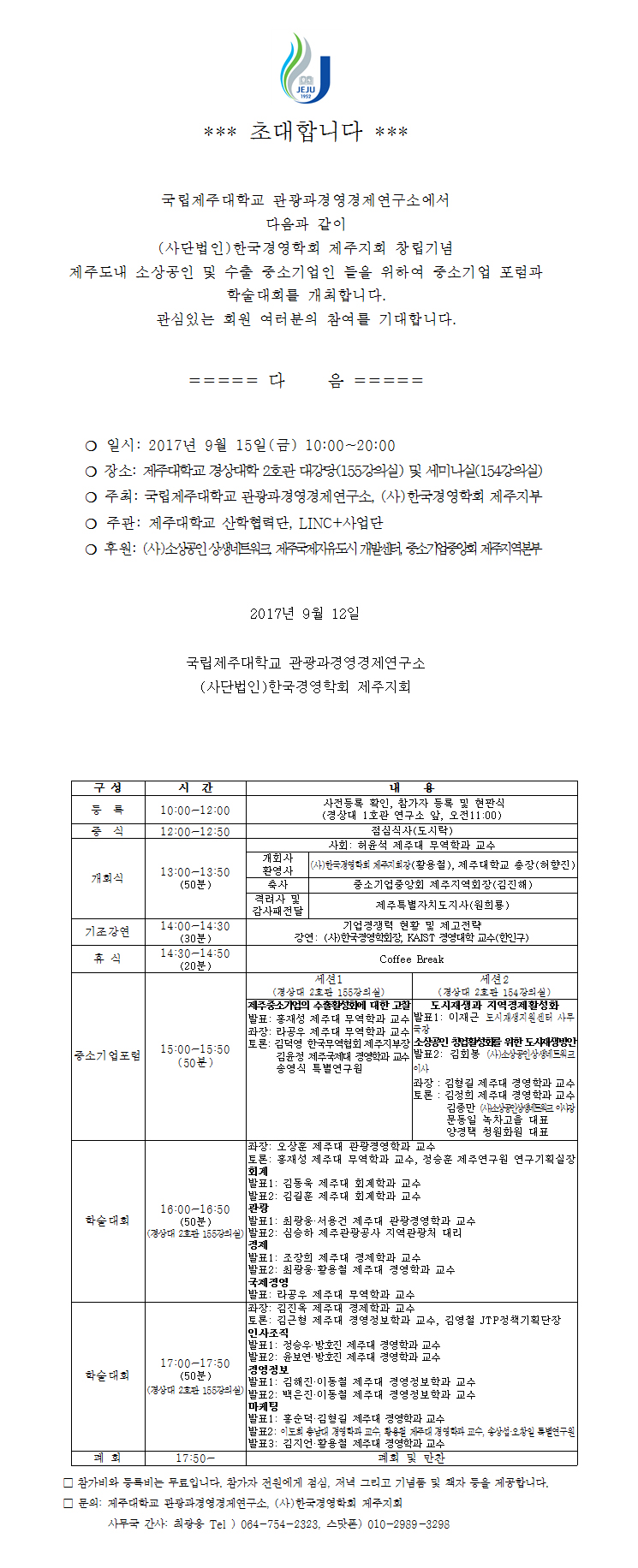 [한국경영학회] 제주지회 창립기념 중소기업 포럼 및 학술대회 안내드립니다.