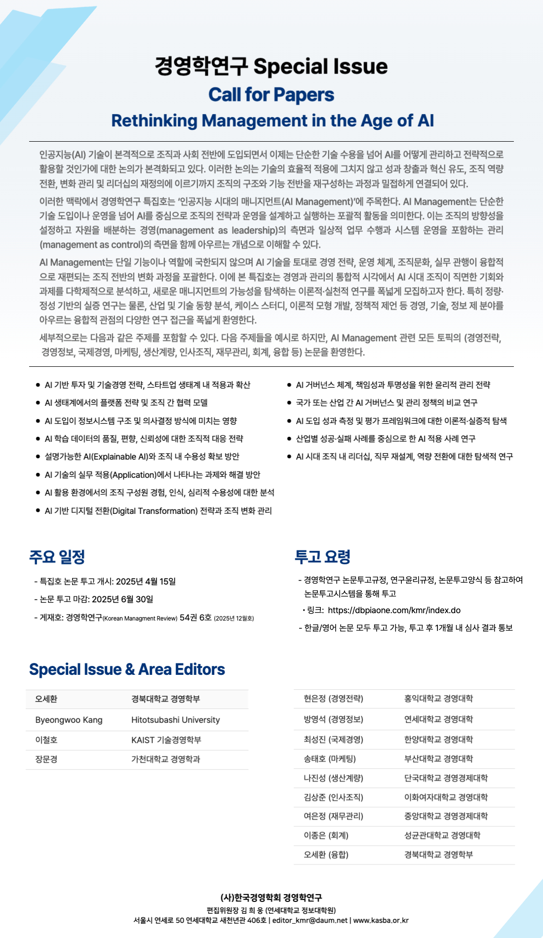 AI Management 관련 주제의 연구 성과를 환영하며, 관심 있는 연구자 여러분의 많은 투고를 부탁드립니다.