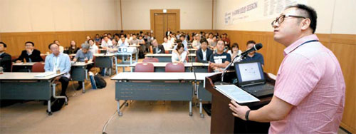 19일 경영학회 통합학술대회 `K-드라마와 창조성` 세션에서 이용석 SBS 드라마본부 수석PD가 드라마에서 경영학적인 측면의 창조성을 어떻게 발견해낼 수 있는지에 대해 설명하고 있다. [김재훈 기자]